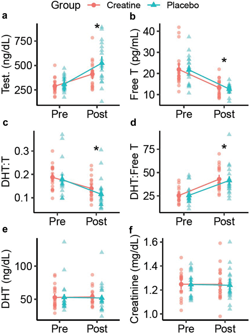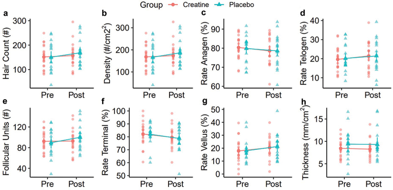 The only significant change as a result of creatine intake was a decrease in testosterone levels. The levels of the other hormones do not show significant differences between the placebo and creatine groups. The proportions of hair in each stage of the hair cycle stay nearly the same.
