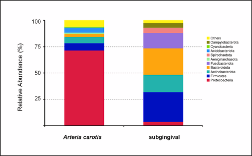 The top ten most abundant phyla were recorded for subgingival samples and carotid stenosis samples, which can be seen below in Figure 1.