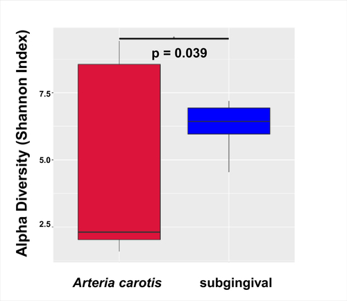 Alpha diversity was lower in the carotid sample, which shows a lower diversity and less even spread of microbial genera, suggesting a more selective colonisation in the atherosclerosis plaques, seen in figure 2.