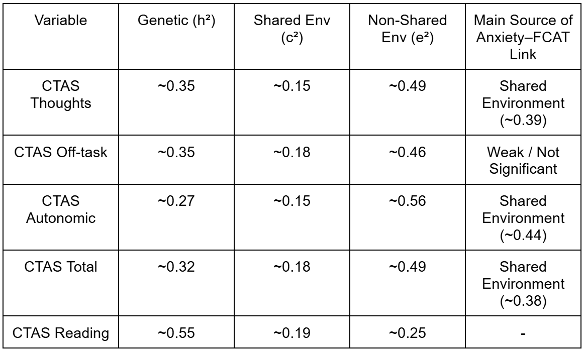 Test anxiety is a situation-specific type of stress that can take up mental space in your working memory, making it harder to focus and perform well, especially on important reading tests. While past research shows that anxiety is linked to slightly lower academic performance, it hasn’t been clear why this happens. In this study, researchers used a twin design to figure out whether the connection between test anxiety and reading scores comes from genetics, shared environments like school or home, or individual experiences. They focused on three parts of test anxiety: anxious thoughts, off-task behaviors, and physical reactions.